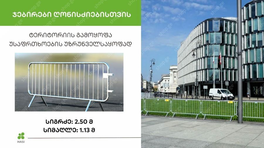 უსაფრთხოების ბარიერი / ჯებირები გამოიყენება ნებისმკერი გარრ ღონისძიების დროს ტერიტორიის განცალკევებისთვის და უსაფრთხოების უზრუნველსაყოფად