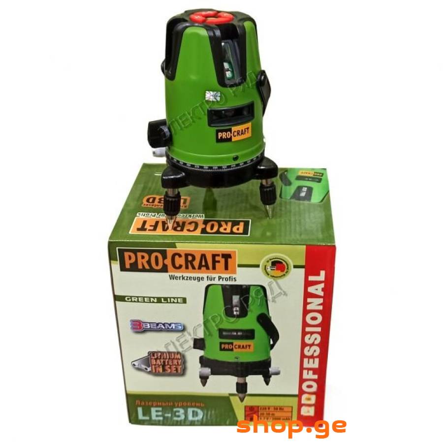 Procraft LE-3D ლაზერი იწონის 2 კგ-ზე ნაკლები. მცირე ზომის წყალობით, მასთან მუშაობა ძალიან მარტივია. გაზომვის მარტივად, შეგიძლიათ გამოიყენოთ შტატივი.