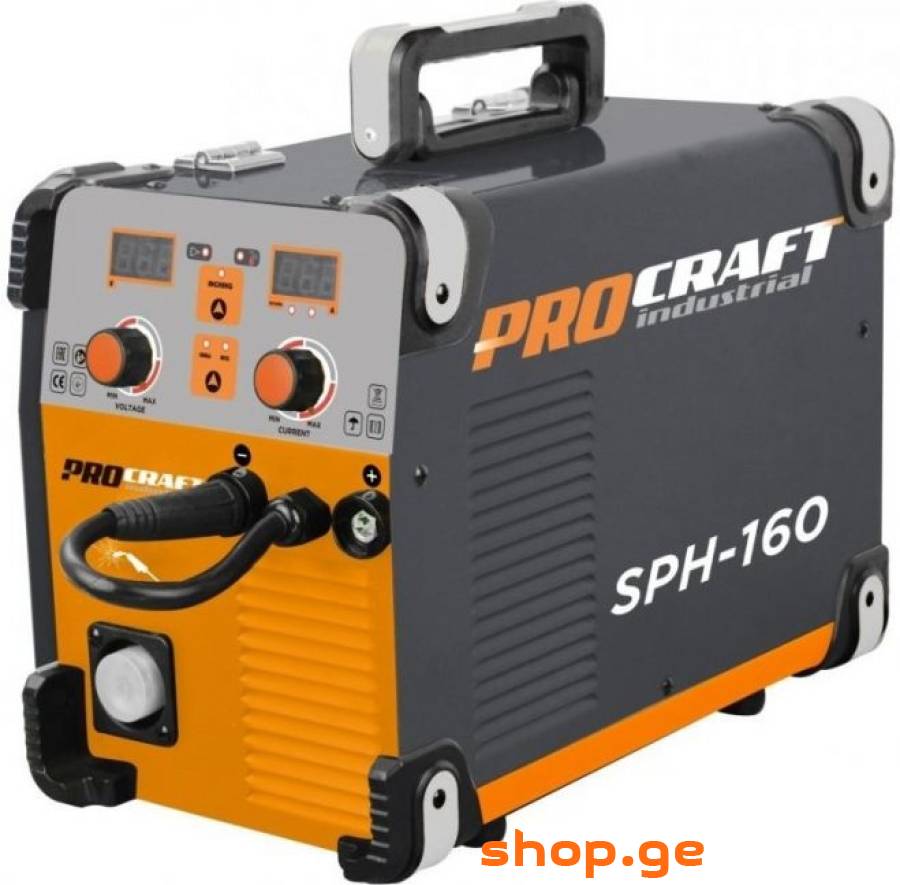 PROCRAFT SPH-160 ინდუსტრიული პროფესიონალური ინვერტორული შედუღების აპარატი .ეს არის უახლესი თაობის კომბინირებული შედუღების აპარატი MIG / MAG და MMA შედუღებისთვის. PROCRAFT SPH-160– ის დიზაინში შედის ყველაზე თანამედროვე მიკროპროცესორული IGBT ტექნოლოგია. ეს შედუღების აპარატი აღჭურვილია მარტივად მუშაობის პანელით და დისპლეით, რომელიც აჩვენებს შედუღების დენის დაყენებულ დენს, რაც ამარტივებს მუშაობას. მოწინავე ელექტრონიკის წყალობით, შედუღების დენის კორექტირება შესაძლებელია ძალიან წვრილად ბლოკების სიზუსტით.