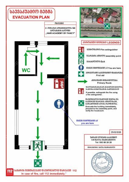 ევაკუაციის მარშრუტების, სახანძრო ინვენტარისა და გამოსასვლელების დატანას;