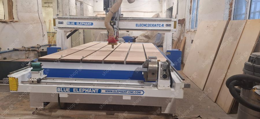 9კვტ შპინდელი, მაგიდა 2X3 ზე, 6 ცალი ფრეზის ავტომატური შეცვლა, ნოლის ავტომატური აღება, 2 ვაკუუმ ტუმბო.