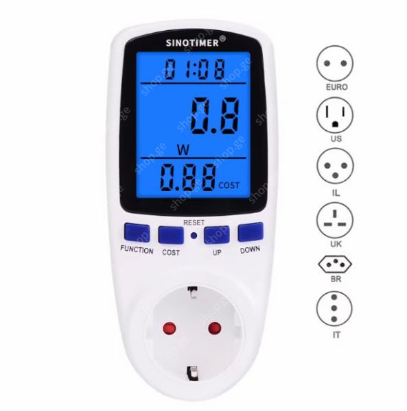 გაზომეთ სხვადასხვა პარამეტრები და გადატვირთვისგან დაცვის ფუნქცია: სიმძლავრე (ვატი), ენერგია (კვტ/სთ), ვოლტი, ამპერი, ჰერცი, სიმძლავრის ფაქტორი და მაქსიმალური სიმძლავრე (ვატი), დრო, დღეები.