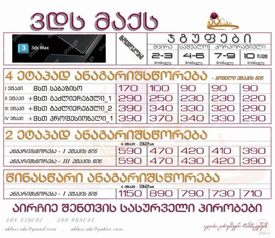 •ინდივიდუალური სწავლა, •მცირე ჯგუფი- 2-3 მსმენელი(ფასდაკლება+), *საშუალო ჯგუფი- 4-6 მსმენელი(ფასდაკლება++), •კორპორატიული ჯგუფი- 7 და მეტი მსმენელი(ფასდაკლება+++;