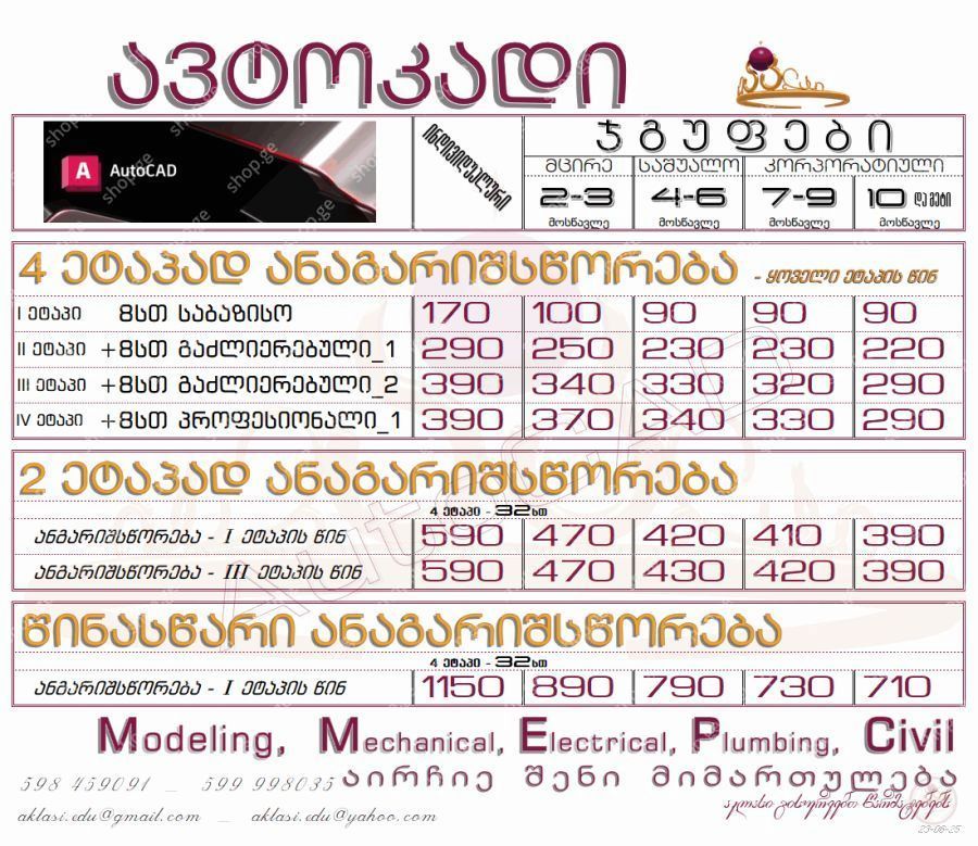 ინდივიდუალური სწავლა, •მცირე ჯგუფი- 2-3 მსმენელი(ფასდაკლება+), *საშუალო ჯგუფი- 4-6 მსმენელი(ფასდაკლება++), •კორპორატიული ჯგუფი- 7 და მეტი მსმენელი(ფასდაკლება+++);