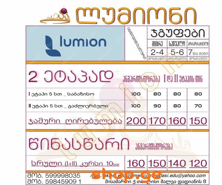 ინდივიდუალური სწავლა, •მცირე ჯგუფი- 2-3 მსმენელი(ფასდაკლება+), *საშუალო ჯგუფი- 4-6 მსმენელი(ფასდაკლება++), •კორპორატიული ჯგუფი- 7 და მეტი მსმენელი(ფასდაკლება+++);