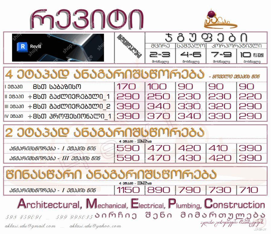 *4.პროფესიონალი (+8სთ): Mass პროფესიონალი - რთული ფორმები სვადასხვა დანიშნულებისთვის; Family პროფესიონალი - constrain-ების გამოყენებით, Curtain Wall პროფესიონალი - ორიგინალური ფორმებითა და Mass-ის გამოყენებით, რთული კონსტრუქციის მრავალსართულიანი შენობების პროექტირება (არასტანდარტული ხერხებით); ოთახების სივრცეები - space; საინჟინრო (კონსტრუქციები და კომუნიკაციები) ნახაზებთან მუშაობა, რენდერი V-ray მიმოხილვა.