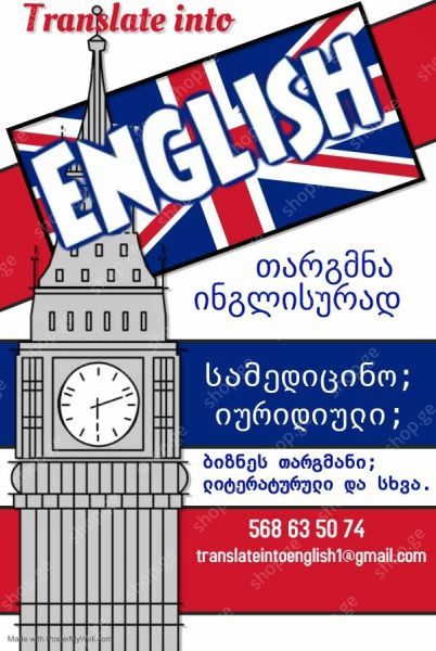 გთხოვთ, დაგვიკავშირდეთ ნომერზე 568635074 ან გადმოაგზავნოთ სათარგმნი მასალა და თქვენი მოთხოვნები (ვადები) შემდეგ ელ.ფოსტაზე: translateintoenglish1@gmail.com