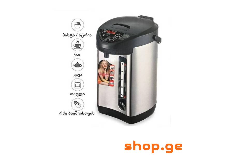 გთავაზობთ BOSCH-ის წყლის მადუღარას (ელექტრო ჩაიდანი, ყავის აპარატი), იგივე თერმო პოტი . ინახავს ცხელ წყალს იქამდე, სანამ დენში იქნება შეერთებული: