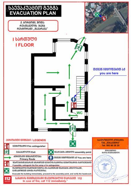 ევაკუაციის მარშრუტების, სახანძრო ინვენტარისა და გამოსასვლელების დატანას;