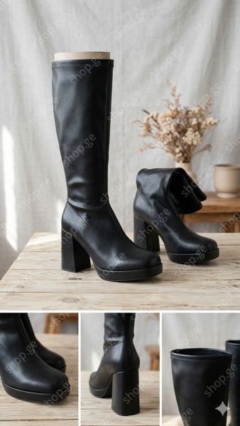 ქალის ჩექმები პლატფორმაზე და მდგრად ქუსლზე (შავი)