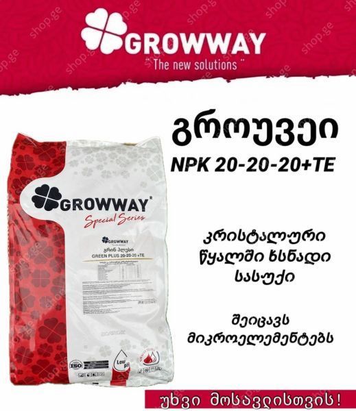 GROWWAY-ის ბრენდის სასუქი 100%-ით ხსნადია და შეიცავს მაკროელემენტების დაბალანსებულ კომპლექტს: