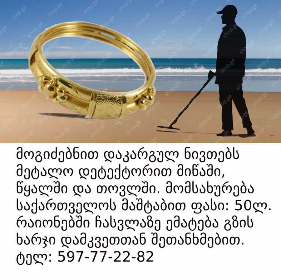 მოგიძებნით ოქროს დაკარგულ ნივთებს, მიწაში, წყალში, თოვლში, შენობებში, სამუშაოს შესრულება პროფესიონალი ოპერატორი ლიცენზირებული, მომსახურეობა 50-ლარი საქართველოს მაშტაბით ნებისმიერ რაიონში ჩასვლა მგზავრობის ხარჯი დამკვეთთან შეთანხმებით. ტელ 598-24-60-50